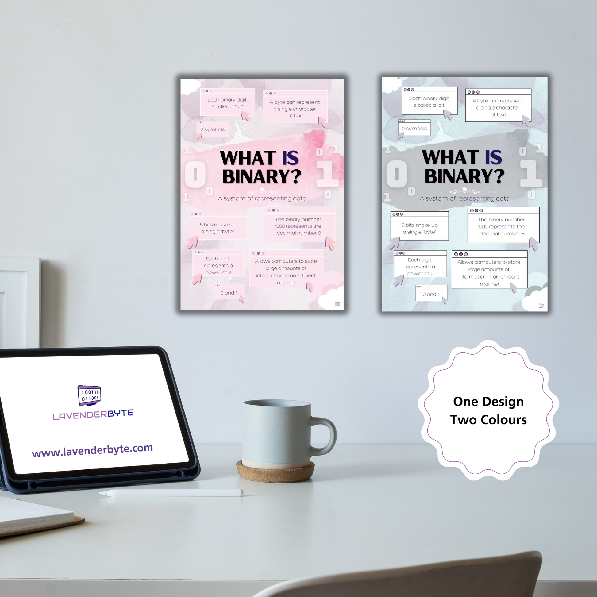 WHAT IS BINARY? Set of 2 posters (Pink and Grey/green).